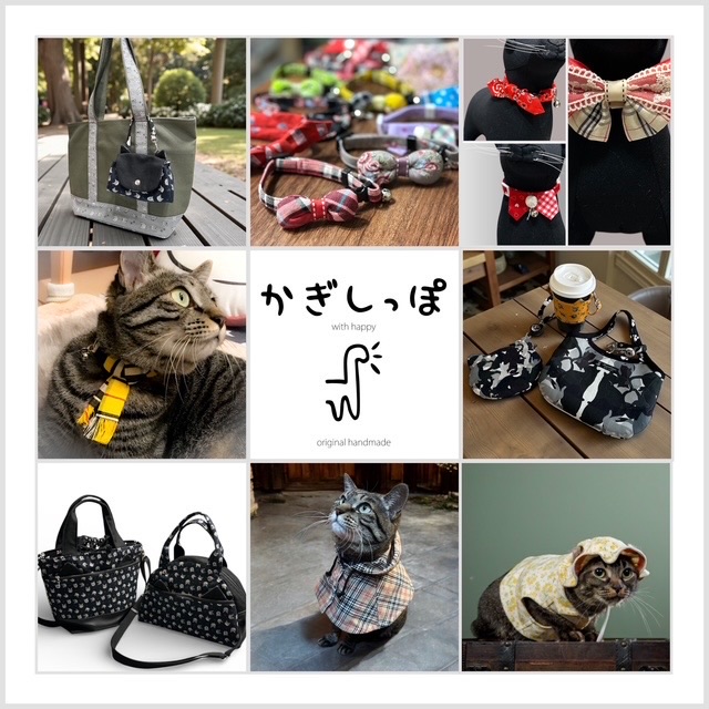 大好きな猫とかぎしっぽなどをテーマとして、ポーチやバック等の布小物から、猫用首輪、猫用洋服、猫オモチャなどの猫ちゃん用グッズを、デザイン及び制作、販売しています。 猫のオーナーさんや愛猫、猫好きな方などすべての方に少しでも喜んでいただけますように、ひとつひとつ心を込めて丁寧な作品作りを心掛けております。 手作りの良さ、温かさを感じて気に入っていただけたら嬉しいです。 そして、みなさまがHappyになりますように・・・Kagishippo with HAPPY!