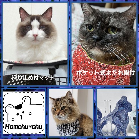 お口のトラブルのある子のためのポケット式よだれ掛けや、キャリーバッグに敷いても便利な滑り止め付マット等、猫ちゃんのための便利な用品を手作りしております。 また、猫モチーフの布小物、樹脂を使った一輪挿しやアクセサリー等の楽しい商品もあります。どうぞよろしくお願いいたします。