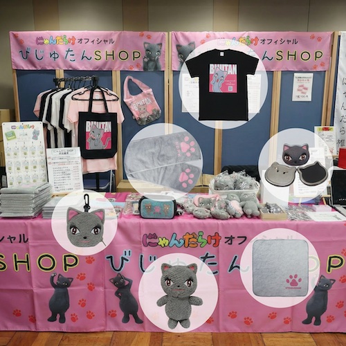 にゃんだらけオフィシャルグッズを販売する「びじゅたんSHOP」です。オフィシャルキャラクターのびじゅたんをモチーフにした可愛いグッズを、たくさんご用意しています。 新商品の「メガネ/スマホ拭き」「クリアファイル20ver.」が初登場!「びじゅたん肉球ミニタオル」や人気の「びじゅたん肉球タオル」「びじゅたん肉球Tシャツ」は、びじゅたんの肉球をトレースしてデザインしました。「びじゅたんエコバッグ」「びじゅたんもこもこぬいぐるみ」「びじゅたんデザインTシャツ」「びじゅたんマグネット」「びじゅたんサコッシュ」など、びじゅたん尽くしのグッズがいっぱい。 ご来場の記念に、ぜひ、お立ち寄りください。