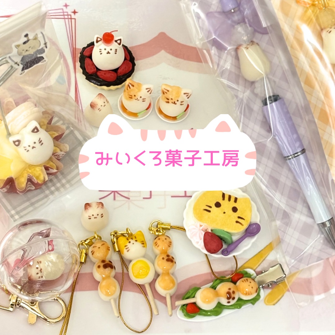 初めましての出展になります。みいくろ菓子工房です。 粘土で猫スイーツモチーフの雑貨を作っています。猫や可愛い物が好きです! ストラップがメインですが、他にもボールペン、インテリア、マグネットなど雑貨をご用意しました。 餅の猫「もちにゃ」、猫団子などゆるくて可愛い猫雑貨がお待ちしています❣️ 可愛い雑貨たちが日常に小さな幸せをお届けします🐱❣️ よろしくお願いします!