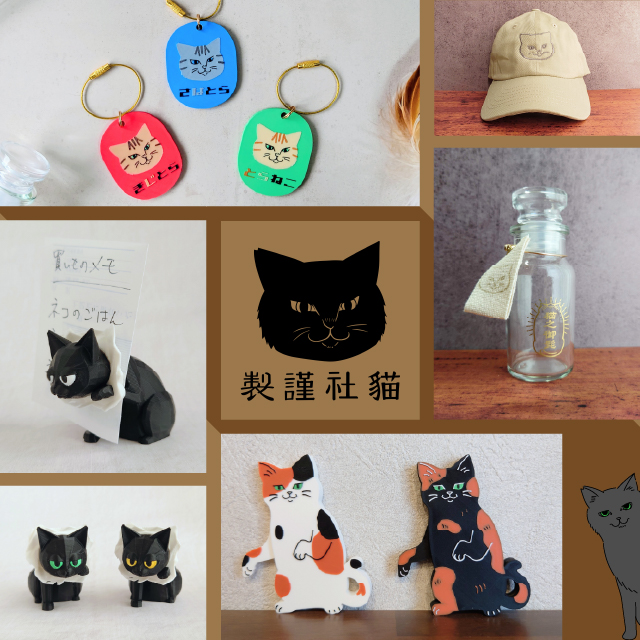 ちょっとレトロでふてぶてしい猫の雑貨を制作しています。 抜けたおひげを保管するための「猫のおひげ瓶」や、猫が紙を破って顔を出している風の「文字が見えない猫メモスタンド」など、実用品(?)をいろいろご用意しております。そのほかちょっとしたプレゼントにぴったりなキーホルダーやガチャガチャもありますので、ぜひお気軽にお立ち寄りください。