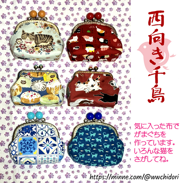 気に入った布でがまぐちを作っています。いろんな猫柄を作っていきますので、ぜひお立ち寄りください!