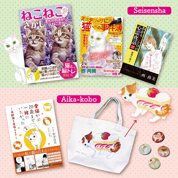 猫が出てくる漫画雑誌や書籍などを作っている出版社&編集プロダクションです。今回は、かわいい猫の写真とイラストを使った間違い探し本「ねこねこさがし」や霊感猫が大活躍する漫画「あかりとシロの心霊夜話」(西尚美著)のコミックス最新刊などの本を中心に、「ゾッチャの日常」でおなじみの生藤由美先生によるキュートな猫&スイーツのイラストを使用したグッズ、韓国発の珍しい猫雑貨など、かわいい猫商品を盛りだくさんでお届けいたします。どうぞお立ち寄りください!
