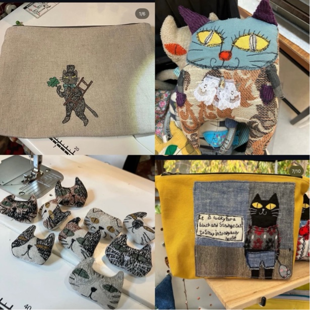 布にミシン刺繍やアップリケで猫の絵を描いて、ポーチやマスコットを作っています。店名が「大きな黒い猫」と言う意味なので、黒猫多め。