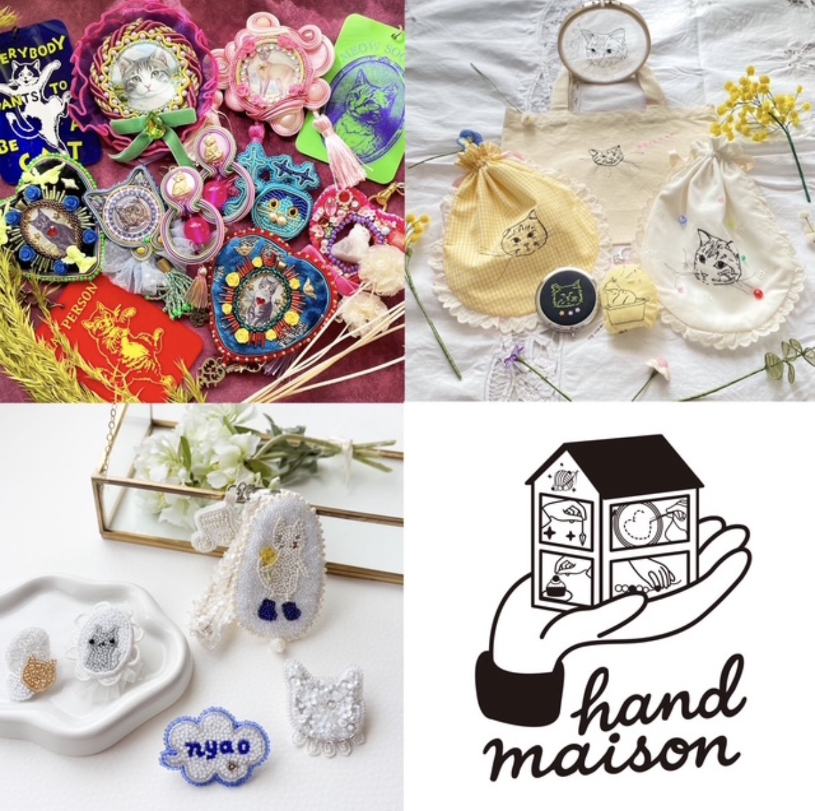hand maisonは、細やかな手仕事を軸に活動する作家ユニットです。 この度はメンバーの中からソウタシエジュエリーの浮力レ乃宵ヨリ、立体刺繍のmimosa、特小ビーズ刺繍のles soeurs beadsが出店。それぞれが丁寧に積み重ねた、繊細な技術と表現。その想いを乗せた作品をお届けいたします。