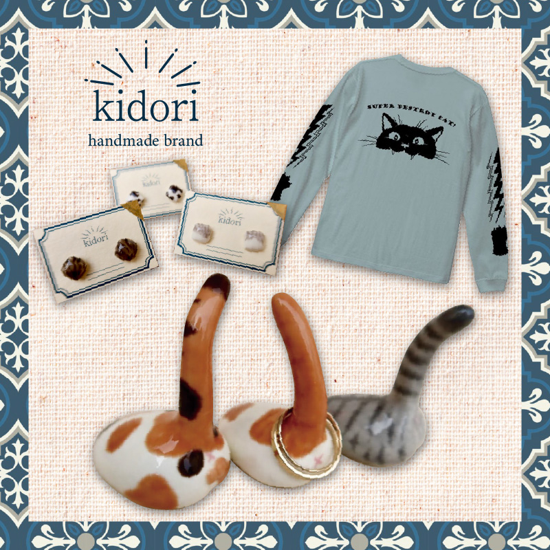 猫派なハンドメイド作家kidoriです!今回のねこまつりフェスでは、人気の猫ちゃん柄のピアス・イヤリング、ねこけつリングスタンドをはじめ、手刷りのアパレルアイテムなども新たに展開予定です!