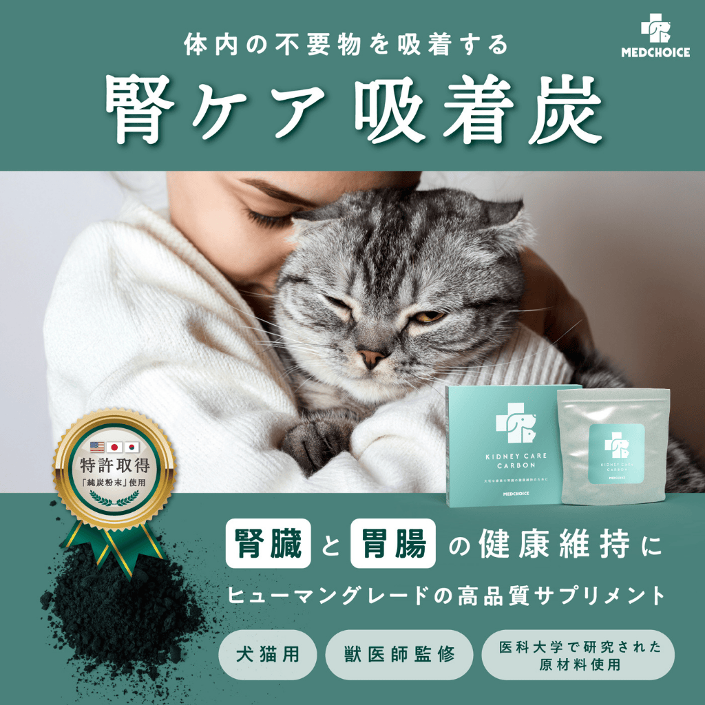 目指したのは、医師も驚く安全品質 医科大学で研究された原材料を使い、獣医師監修で作られたヒューマングレード品質サプリメント。 大切な家族の腎臓と胃腸の健康維持に。 【腎ケアカーボンの 3つのこだわり】 ①機能性へのこだわり ・腎臓の健康維持をサポート 純炭粉末、キトサン、炭酸カルシウムを使用し、腎臓の負担になるリンや不要物(食事に伴う添加物等の腸内容物)等を吸着。 ・胃腸の健康もサポート トクホにも使用されるガラクトオリゴ糖やラフィノース、食物繊維(イヌリン)を配合し、腸内の善玉菌を補給。 ・気になるニオイを抑制 便や口臭など腎臓トラブルに伴う不快なニオイを抑える効果も期待される。 ②食べやすさへのこだわり ・余計な味付けなし、いつものフードにかけるだけ ・ふりかけタイプでお気に入りのフードに混ぜるだけ。 ・フードの味を邪魔せず、好き嫌いの激しいペットでも違和感なく摂取可能。 心配な方のためにお試しパックもご用意しております。 ③素材と製造へのこだわり ・製造は国内GMP基準工場で行い、保存料・香料・甘味料は不使用。小動物臨床経験豊富な博士号取得の獣医師が監修し、原料選定から製造工程まで徹底した品質管理を行っています。