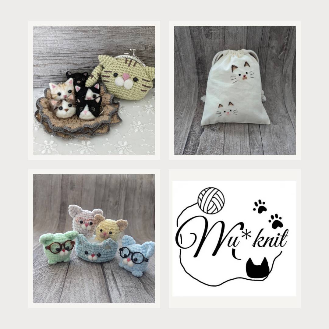 手編みの猫のがま口や編みぐるみ、羊毛フェルトの猫のキーホルダーや羊毛刺繍の小物を作っています。にゃんだらけ初出展です!!Mu*knit オリジナルの猫グッズを見にきてください。