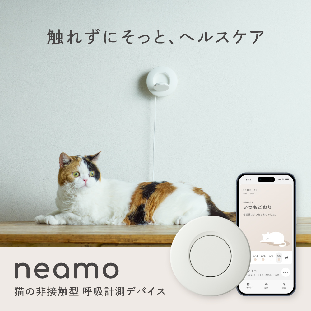 neamoは、LIXILが開発した非接触型の健康管理デバイスです。 猫ちゃんに触れずに呼吸を計測し、目に見えづらい小さな変化もキャッチ。いつもとの違いに気づくことで早めの対策につなげ、愛猫の健康を守ります。 Makuakeにて数量・期間限定で販売中です!