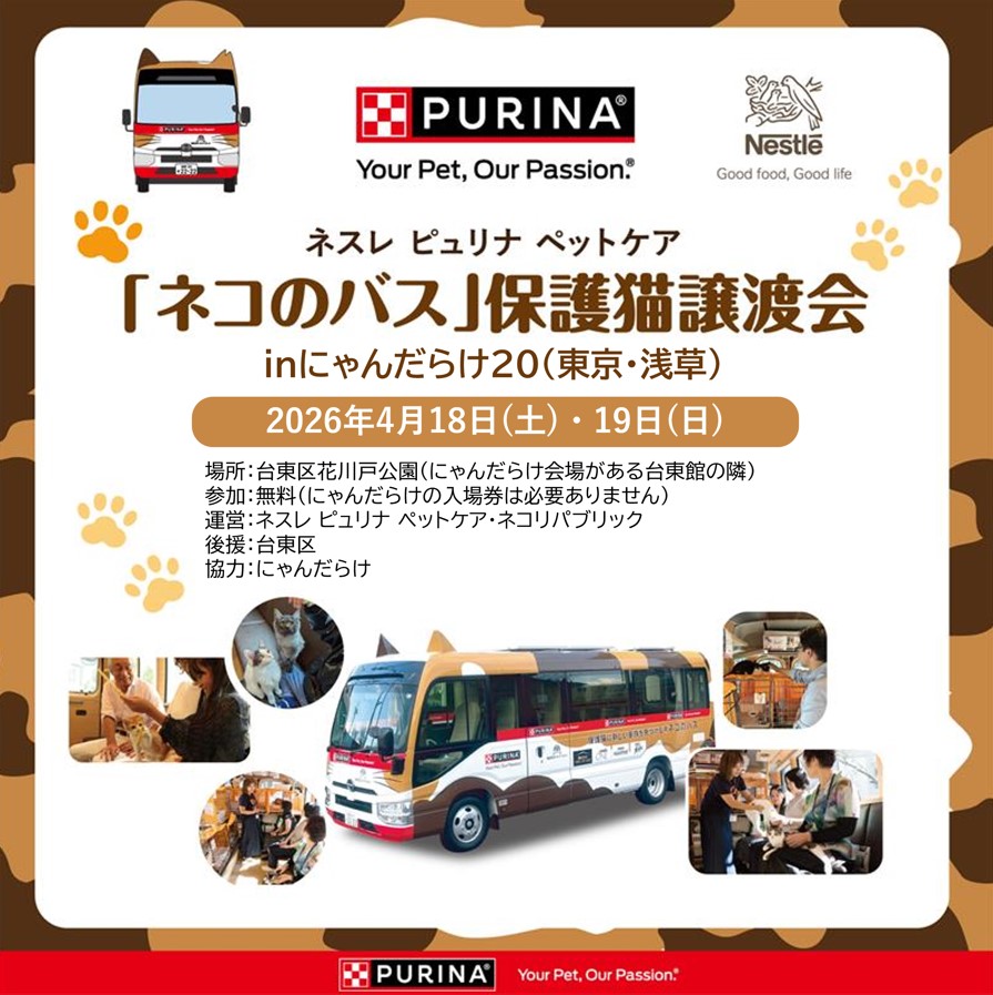 ネスレ ピュリナでは、保護猫の認知拡大と譲渡促進のために、保護猫が新しい家族と出会うための場所として「ネコのバス」を利用した譲渡会を開催しています。 2018年4月から活動を開始し、「ネコのバス」から360頭以上の保護猫たちが新しい家族の元へ迎えられました。※2025年末時点