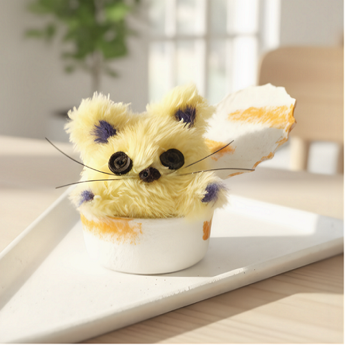 『猫缶』 昭和の缶切りでキコキコと開ける、どこか懐かしい缶詰がモチーフの「ぷらん缶」。 その中からひょっこり顔を出すのは、猫のぬいぐるみです。 ふわふわの毛並みに、ちょこんと付いた三角の耳。 アンティークの割れが入ったボタンや星形のボタンの目がチャームポイント。 どこかレトロで温かみのある表情を生み出しています。 ちょっと不思議で愛らしいぬいぐるみです。 ネコちゃんのぬいぐるみは取り出せますよ(ぬいぐるみ単体でも販売)。 「ぷらん缶」は、お菓子入れなどの小物入れや、多肉植物やサボテンのプランターとしても活躍します。 その他、モールで作ったシッポの長~いマーブル模様のにゃんこや、かわいい動物達がお出迎えします。