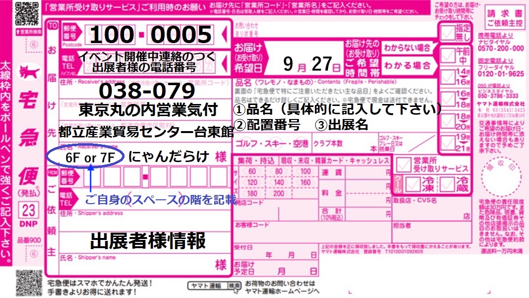 ・上記の方法でお送りいただきましたお荷物は、開催当日10:00頃に6階と7階に分かれて到着します。荷物が届きましたら、会場アナウンスでお知らせいたしますので伝票をお持ちになって各自でのお引き取り、ご自分のスペースまでの運搬をお願い致します。