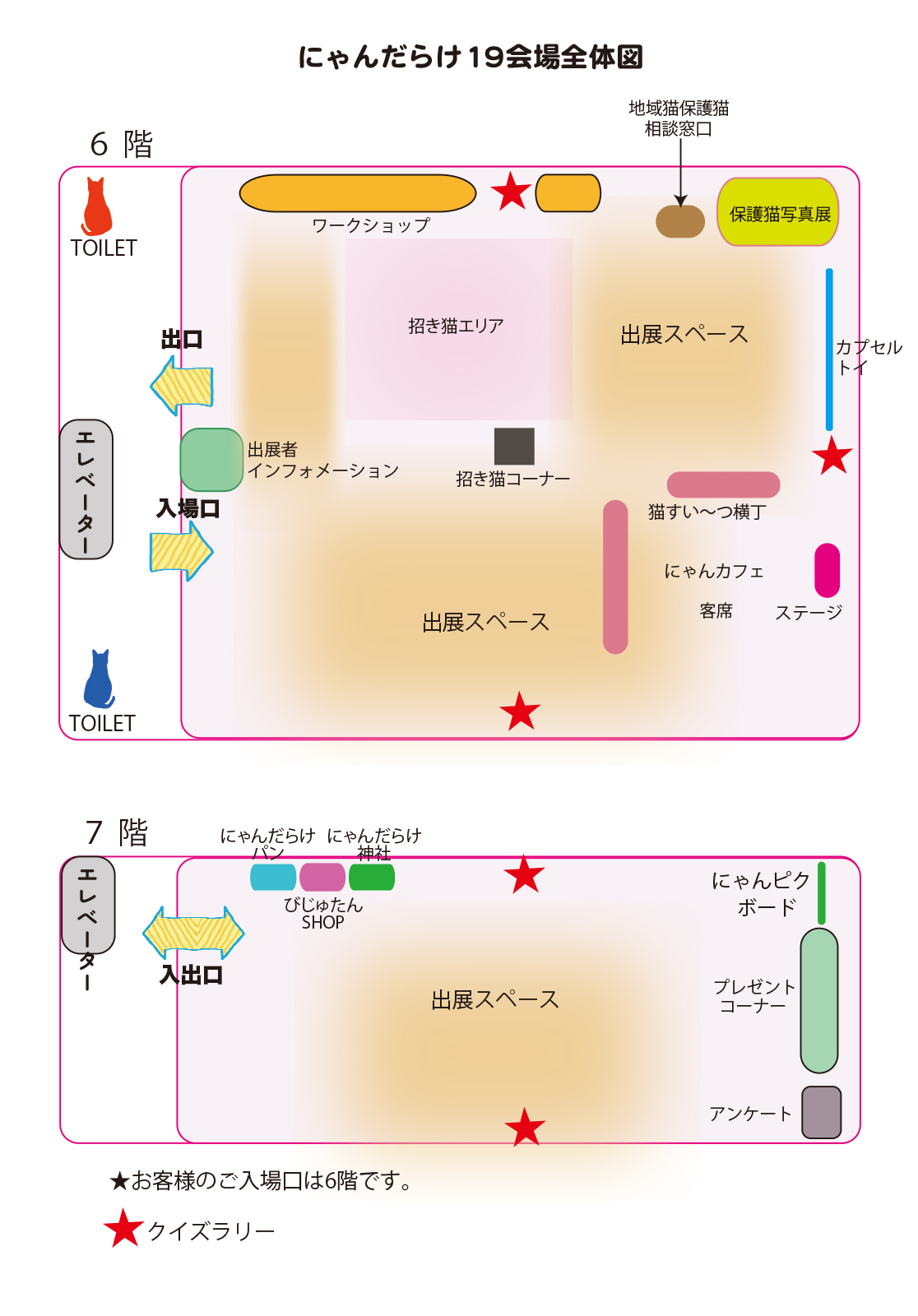 6階/お客様受付、出展者様インフォメーション、ステージ、保護猫写真展、猫すい〜つ横丁&にゃんカフェ、ワークショップコーナー、招き猫コーナー、にゃんクイズラリー